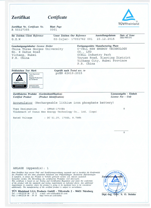 電池系統(tǒng)(IFM48-1700E4)認(rèn)證證書