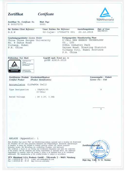 電池(IFpR26 65)6219:2015認(rèn)證證書